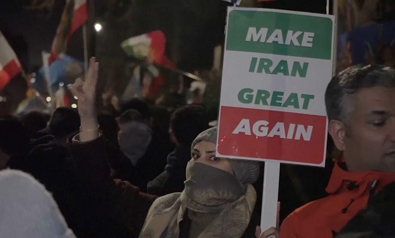 معترضان پرچمهای نظام پادشاهی پیشین ایران که در سال ۱۹۷۹ سرنگون شد را بهاهتزاز درآوردند و پلاکاردهایی با نوشته «ایران را دوباره بزرگ کنیم» در دست داشتند.